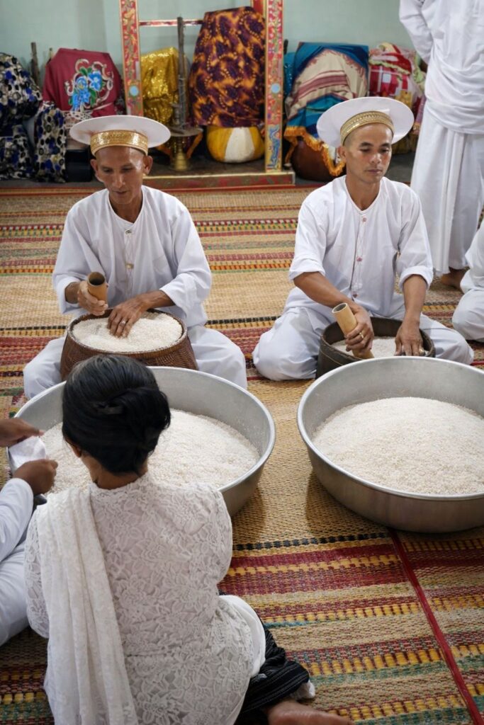 Trước khi chia gạo, các Po Acar phải báo cho vị Imâm Tal biết số người đã mất và còn sống trong dòng tộc. Vị Imâm Tar dùng ống tre để đong gạo, đầu dài cho đàn ông, đầu ngắn cho phụ nữ. Phần xúc phía trước là cho người sống, phía sau là cho người đã khuất. Mỗi người được đong 3 ống gạo.